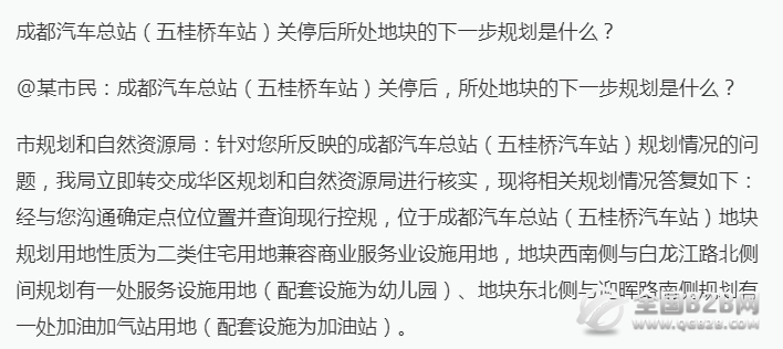 成都汽车总站(五桂桥车站)关停后,所处地块的下一步规划是什么?据市规划和自然资源局回复:位于成都汽车总站(五桂桥汽车站)地块规划用地性质为二类住宅用地兼容商业服务业设施用地,地块西南侧与白龙江路北侧间规划有一处服务设施用地(配套设施为幼儿园)、地块东北侧与迎晖路南侧规划有一处加油加气站用地(配套设施为加油站)。