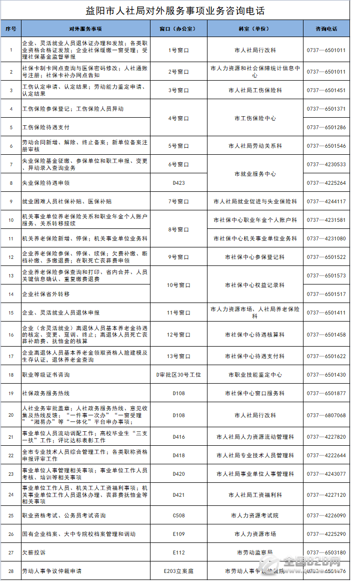 益阳市人力资源和社会保障局对外服务事项服务业务咨询电话汇总表:益阳市人力资源和社会保障局公布了各部门服务电话号码,大家如需咨询有关人社政策业务,可拨打相应的咨询电话号码。足不出户咨询业务,收藏用好。