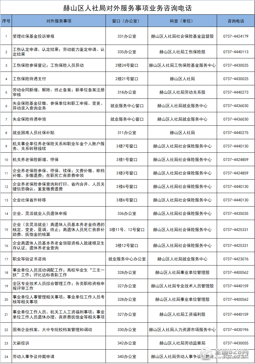 益阳市赫山区人力资源和社会保障局对外服务事项业务咨询电话汇总表:益阳市赫山区人力资源和社会保障局对外服务事项业务咨询电话,益阳市赫山区人力资源和社会保障局公布了人社各个部门服务电话号码,大家如需咨询有关人社政策业务,可拨打相应的咨询电话号码。足不出户咨询业务,收藏用好。