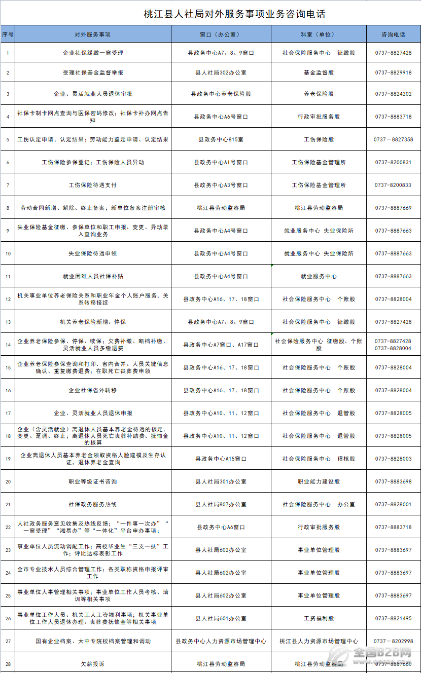 桃江县人力资源和社会保障局各个部门业务服务咨询电话汇总表:益阳市桃江县人力资源和社会保障局各个部门服务电话号码,益阳市桃江县人力资源和社会保障局公布了人社各个部门服务电话号码,大家如需咨询有关人社政策业务,可拨打相应的咨询电话号码。足不出户咨询业务,收藏用好。