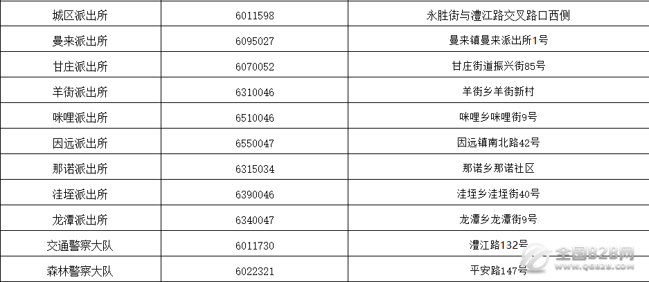 元江县各派出所办公电话与办公地址信息汇总表。