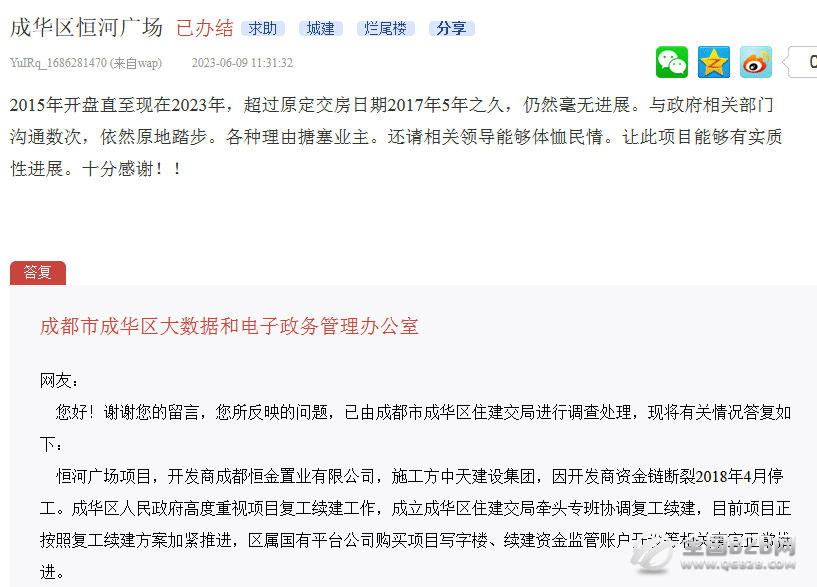 另外,成华区大数据和电子政务管理办公室在6月13日给业主的答复信中也说到“成华区人民政府高度重视项目复工续建工作,成立成华区住建交局牵头专班协调复工续建,目前项目正按照复工续建方案加紧推进,区属国有平台公司购买项目写字楼、续建资金监管账户开设等相关事宜正常推进。”