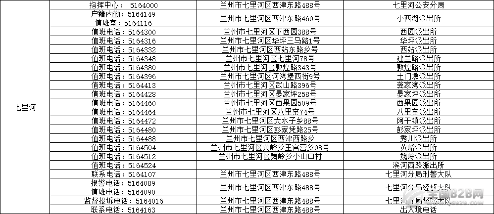 兰州市七里河区各派出所值班室电话号码和办公地址信息汇总表。
