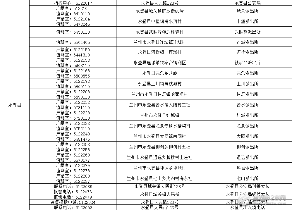 永登县各派出所值班室电话、户籍室电话及出入境业务电话汇总表。兰州永登县各派出所值班室电话号码、户籍室电话和地址信息汇总如下: