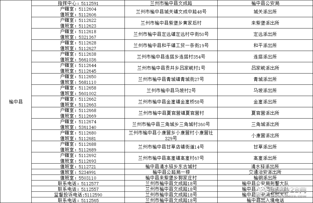 兰州市榆中县出入境业务电话和各派出所值班室电话、户籍室电话汇总表。兰州榆中县各派出所值班室电话、户籍室电话和地址信息汇总如下: