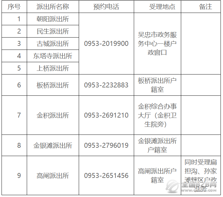 吴忠市利通区各个辖区派出所户政业务服务窗口办理预约电话汇总表。