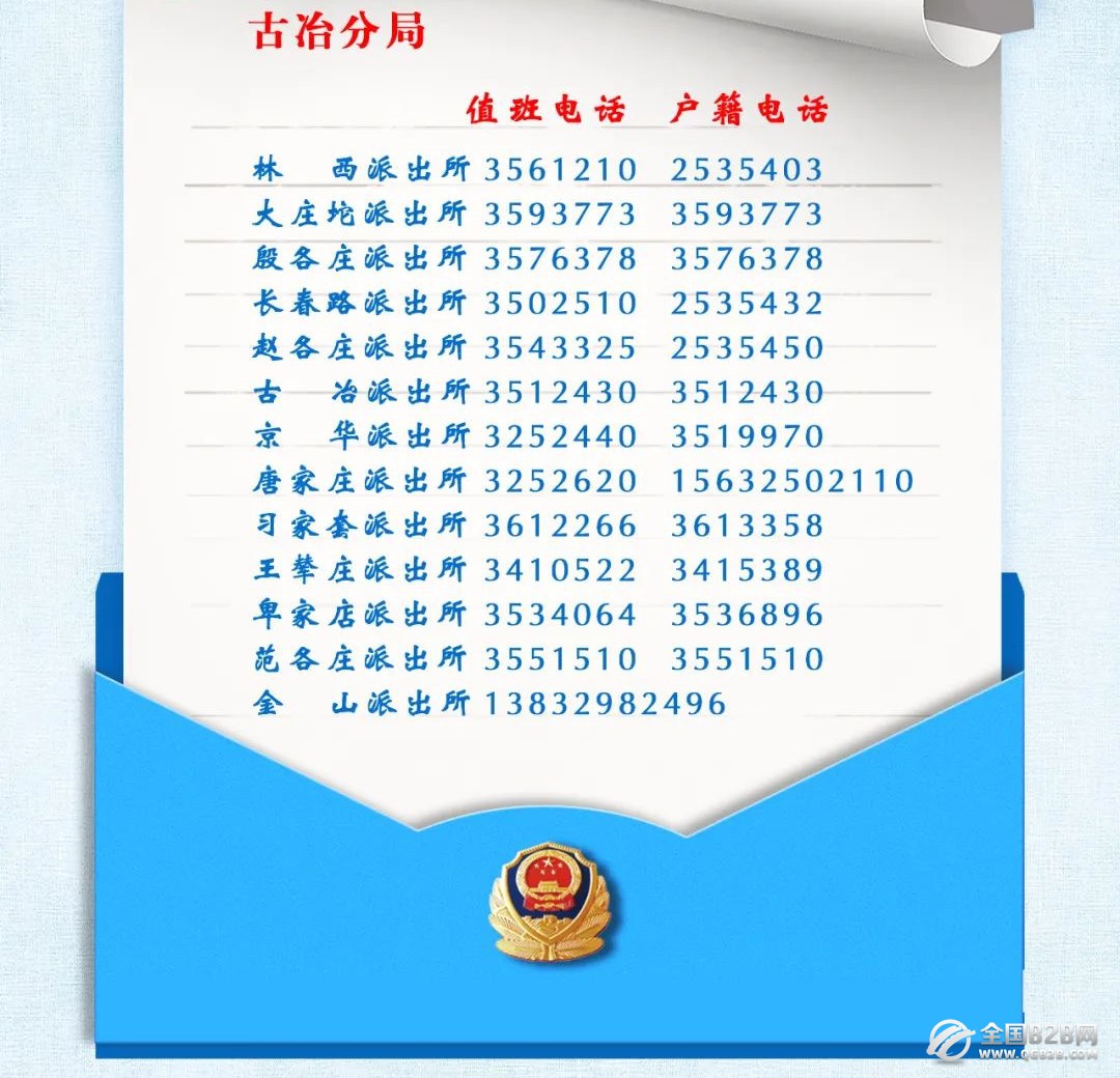 唐山市古冶区各个派出所值班电话号码和户籍咨询电话汇总表:为进一步方便广大的唐山市人民群众,唐山市古冶区对辖区派出所值班电话及户籍电话进行了系统全面梳理,现将各派出所电话公布给大家,如有治安、刑事类报警、违法犯罪线索举报、工作类咨询或户籍类问题可直接拨打派出所值班电话及户籍电话。唐山市古冶区各个派出所将以热情地服务、快速地反应、高效地服务,全力提升人民群众安全感满意度。