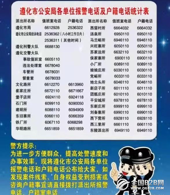 遵化市各派出所值班电话和户籍咨询电话统计表:遵化市各派出所值班电话和户籍咨询电话,为进一步方便群众,提高处理速度和办事效率,现将遵化市辖区各派出所值班电话和户籍电话公布给大家。