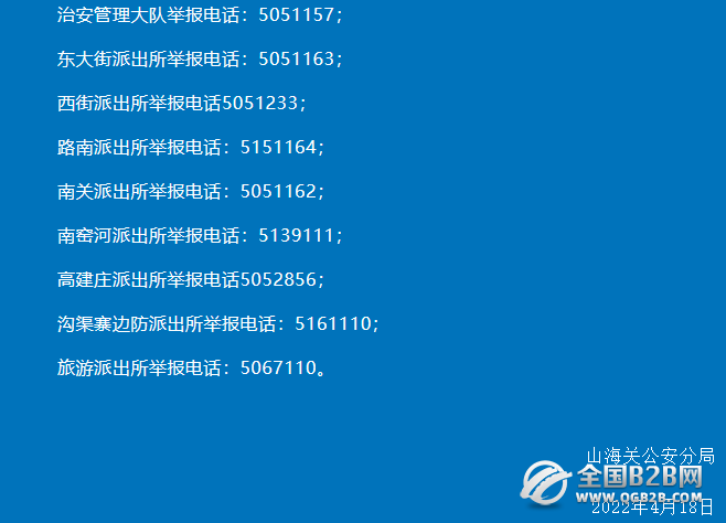 秦皇岛市山海关区各属地派出所24小时值班电话汇总表。秦皇岛市山海关区各派出所24小时值班电话汇总如下: