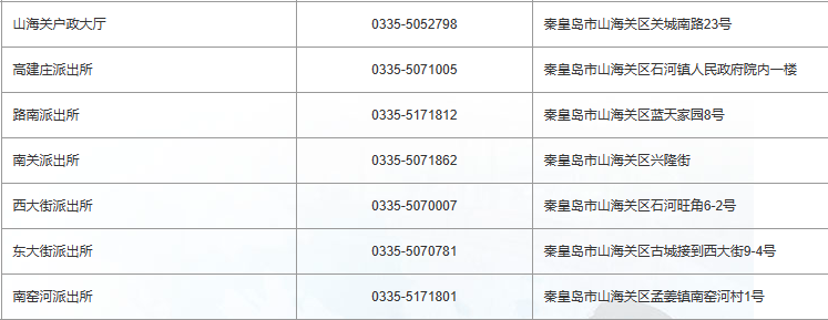 秦皇岛市山海关区各辖区派出所户政咨询电话汇总表。秦皇岛市山海关区各派出所户政咨询电话是多少: