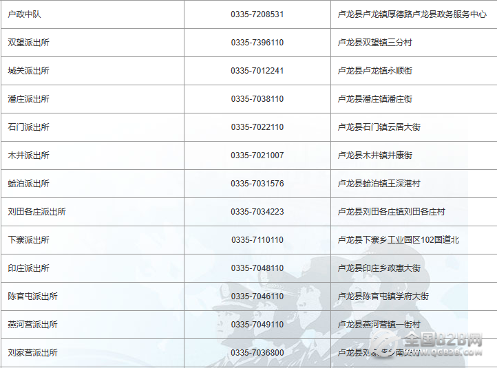 秦皇岛市卢龙县各辖区派出所户政咨询电话号码汇总表。秦皇岛市卢龙县各派出所户政咨询电话号码汇总如下: