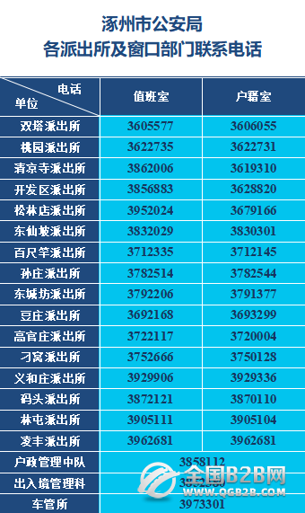 涿州市各辖区派出所值班室电话和户籍室电话号码汇总表。为营造良好的法治化营商环境,为涿州全市经济高质量发展贡献力量,涿州市现将各派出所及窗口部门联系电话予以公布,欢迎社会各界和广大企业主遇到相关问题时,及时反映咨询!涿州市各派出所值班室电话和户籍室电话号码大全表: