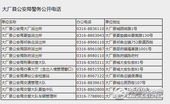大厂县各个派出所联系电话、交警大队电话及单位地址汇总表:为进一步方便广大的大厂县人民群众,为此对辖区派出所值班联系电话及地址进行了系统全面梳理,现将各派出所电话公布给大家,如有治安、刑事类报警、违法犯罪线索举报、工作类咨询或户籍类问题可直接拨打派出所值班电话及户籍电话。大厂县辖区各个派出所将以热情地服务、快速地反应、高效地服务,全力提升人民群众安全感满意度。