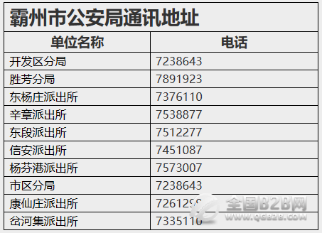 霸州市各基层派出所联系电话号码汇总表:为进一步方便广大的霸州市人民群众,为此对辖区派出所值班联系电话及地址进行了系统全面梳理,现将各派出所电话公布给大家,如有治安、刑事类报警、违法犯罪线索举报、工作类咨询或户籍类问题可直接拨打派出所值班电话及户籍电话。霸州市辖区各个派出所将以热情地服务、快速地反应、高效地服务,全力提升人民群众安全感满意度。