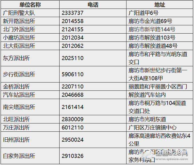 廊坊市广阳区各个派出所联系电话号码及地址信息汇总表。廊坊市广阳区各派出所联系电话号码及地址信息汇总如下: