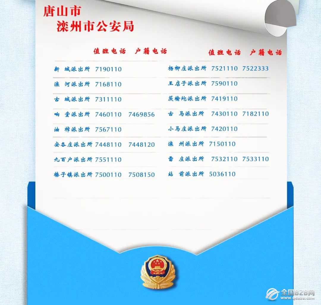 唐山滦州市各辖区派出所值班联系电话及户籍咨询电话号码汇总表:为进一步方便广大的滦州市人民群众,滦州市路北区对辖区派出所值班电话及户籍电话进行了系统全面梳理,现将各派出所电话公布给大家,如有治安、刑事类报警、违法犯罪线索举报、工作类咨询或户籍类问题可直接拨打派出所值班电话及户籍电话。滦州市辖区各个派出所将以热情地服务、快速地反应、高效地服务,全力提升人民群众安全感满意度。