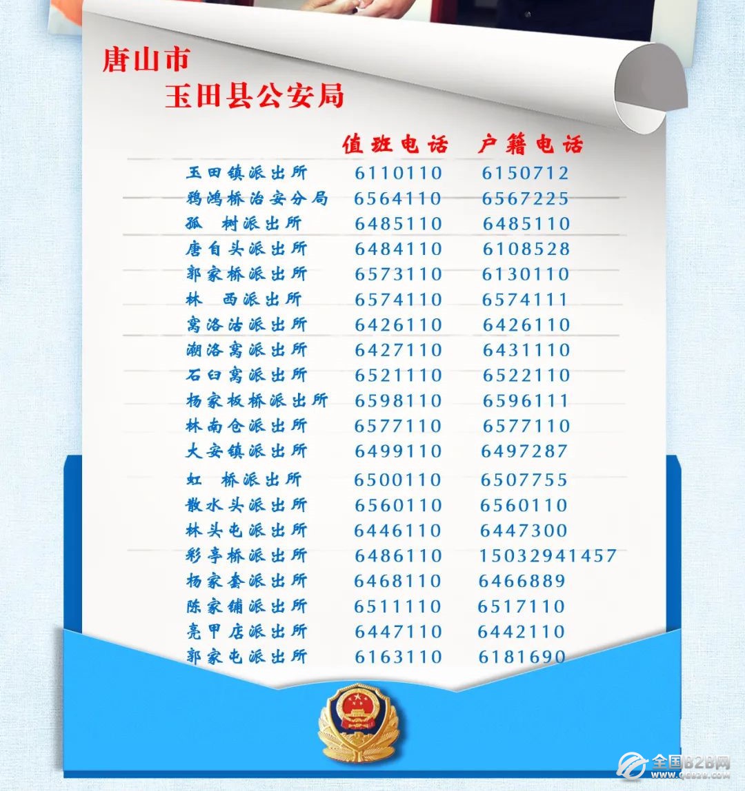 唐山市玉田县各个派出所值班电话号码和户籍咨询电话汇总表:为进一步方便广大的玉田县人民群众,玉田县对辖区派出所值班电话及户籍电话进行了系统全面梳理,现将各派出所电话公布给大家,如有治安、刑事类报警、违法犯罪线索举报、工作类咨询或户籍类问题可直接拨打派出所值班电话及户籍电话。玉田县辖区各个派出所将以热情地服务、快速地反应、高效地服务,全力提升人民群众安全感满意度。