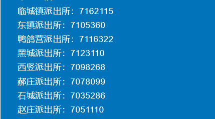 说明:关于邢台市临城县各属地派出所联系电话号码汇总表的信息作出免责声明:关于此信息作出免责声明,此信息图文仅供参考,小编不承担任何法律责任。此信息来源于有关机构的公开内容,在此经过整理并转载,唯一的目的是通过互联网传播便民惠民信息。由于时间等原因,难免使信息发生变更,此信息如有侵权,或者差错,请联系删除,直接联系秋果黄页网客服电话(187-8199-3958微信同号),一定会及时删除和修正。