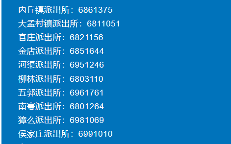 提示:关于邢台市内丘县范围内各派出所值班联系电话大全的信息作出免责声明:关于此信息作出免责声明,此信息图文仅供参考,小编不承担任何法律责任。此信息来源于有关机构的公开内容,在此经过整理并转载,唯一的目的是通过互联网传播便民惠民信息。由于时间等原因,难免使信息发生变更,此信息如有侵权,或者差错,请联系删除,直接联系秋果黄页网客服电话(187-8199-3958微信同号),一定会及时删除和修正。