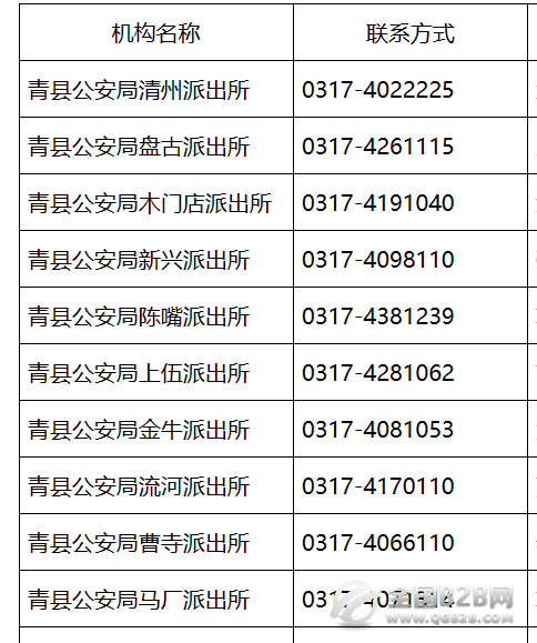 提示:关于沧州市青县各辖区派出所联系电话号码大全的信息作出免责声明:关于此信息作出免责声明,此信息图文仅供参考,小编不承担任何法律责任。此信息来源于有关机构的公开内容,在此经过整理并转载,唯一的目的是通过互联网传播便民惠民信息。由于时间等原因,难免使信息发生变更,此信息如有侵权,或者差错,请联系删除,直接联系秋果黄页网客服电话(187-8199-3958微信同号),一定会及时删除和修正。