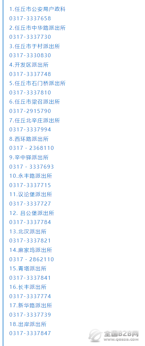 说明:关于任丘市范围内各派出所户籍户政咨询电话号码的信息作出免责声明:关于此信息作出免责声明,此信息图文仅供参考,小编不承担任何法律责任。此信息来源于有关机构的公开内容,在此经过整理并转载,唯一的目的是通过互联网传播便民惠民信息。由于时间等原因,难免使信息发生变更,此信息如有侵权,或者差错,请联系删除,直接联系秋果黄页网客服电话(187-8199-3958微信同号),一定会及时删除和修正。