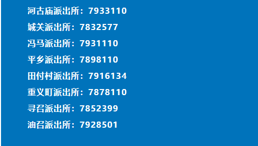 说明:关于邢台市平乡县各个辖区派出所联系电话号码的信息作出免责声明:关于此信息作出免责声明,此信息图文仅供参考,小编不承担任何法律责任。此信息来源于有关机构的公开内容,在此经过整理并转载,唯一的目的是通过互联网传播便民惠民信息。由于时间等原因,难免使信息发生变更,此信息如有侵权,或者差错,请联系删除,直接联系秋果黄页网客服电话(187-8199-3958微信同号),一定会及时删除和修正。