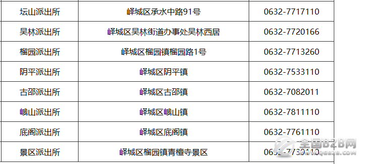提示:关于枣庄市峄城区各个派出所电话及地址信息作出免责声明:关于此信息作出免责声明,此信息图文仅供参考,小编不承担任何法律责任。此信息来源于有关机构的公开内容,在此经过整理并转载,唯一的目的是通过互联网传播便民惠民信息。由于时间等原因,难免使信息发生变更,此信息如有侵权,或者差错,请联系删除,直接联系秋果黄页网客服电话(187-8199-3958微信同号),一定会及时删除和修正。