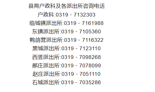 提示:关于临城县各个辖区派出所户籍服务电话号码大全的信息作出免责声明:关于此信息作出免责声明,此信息图文仅供参考,小编不承担任何法律责任。此信息来源于有关机构的公开内容,在此经过整理并转载,唯一的目的是通过互联网传播便民惠民信息。由于时间等原因,难免使信息发生变更,此信息如有侵权,或者差错,请联系删除,直接联系秋果黄页网客服电话(187-8199-3958微信同号),一定会及时删除和修正。