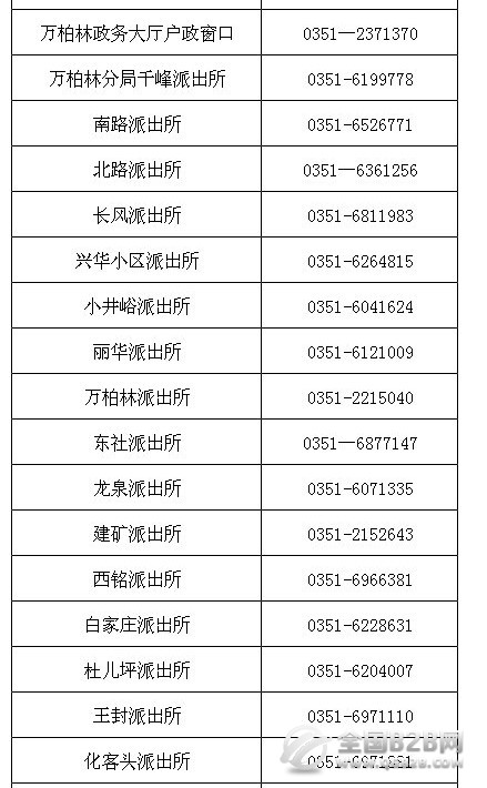 太原市万柏林区范围内各派出所户籍服务电话号码大全: