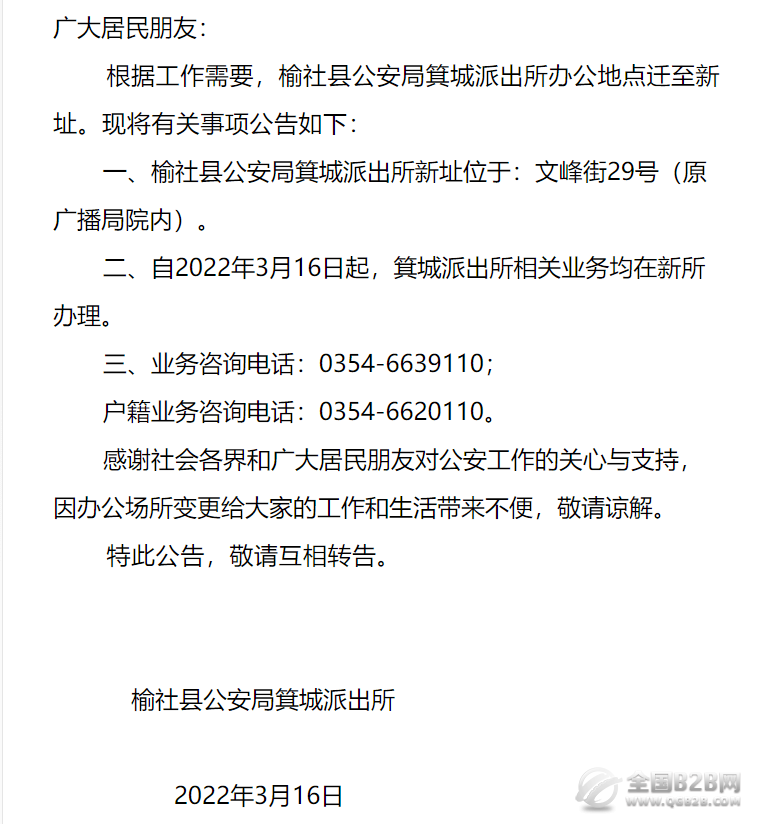 根据工作需要,榆社县公安局箕城派出所办公地点迁至新址。现将有关事项公告如下: