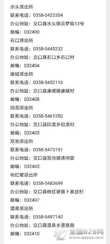 交口县各派出所联系电话号码邮编及办公地址信息大全: