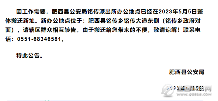 肥西县铭传派出所办公地点搬迁及联系电话公告: