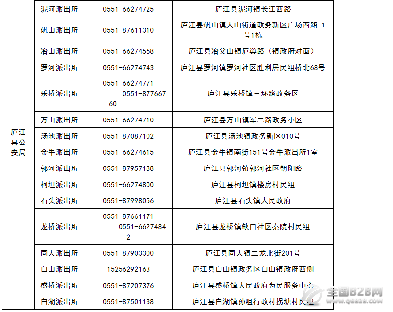 合肥庐江县辖区派出所户籍户政窗口咨询电话及地址一览表: