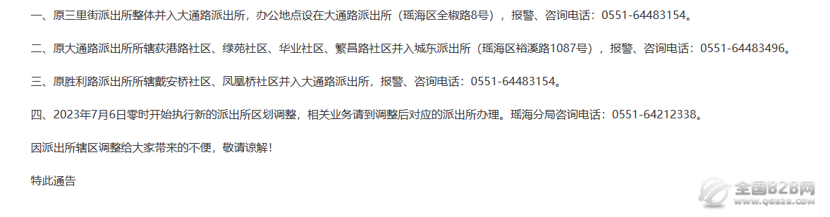 根据工作需要,合肥市瑶海分局对辖区部分派出所作出调整,相应管辖区域发生变化,现将有关事项通告如下: