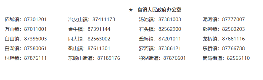 合肥庐江县各镇人民政府办公室联系电话名录: