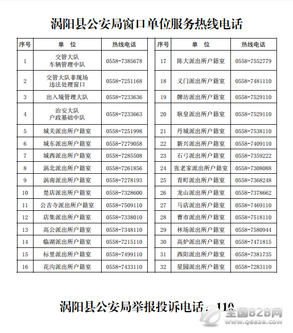 毫州市涡阳县各派出所户籍服务热线电话大全:结合活动相关要求,统一开通服务热线电话,进一步方便群众咨询、及时解答群众疑问,真正做到让群众“少跑腿、多办事”,不断优化办事程序、提高办事效率,以实际行动推进涡阳辖区派出所工作再上新台阶。现将涡阳县各派出所户籍服务热线电话公布如下。