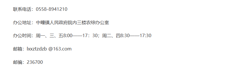 提示:利辛县中疃镇农业综合办公室联系电话信息来源于利辛县政府网站公开之内容,整理转载此文是出于传递更多便民服务信息之目的。若有来源标注错误或者其它差错或侵犯了您的合法权益,请与本网站联系,我们将及时更正、删除,谢谢。