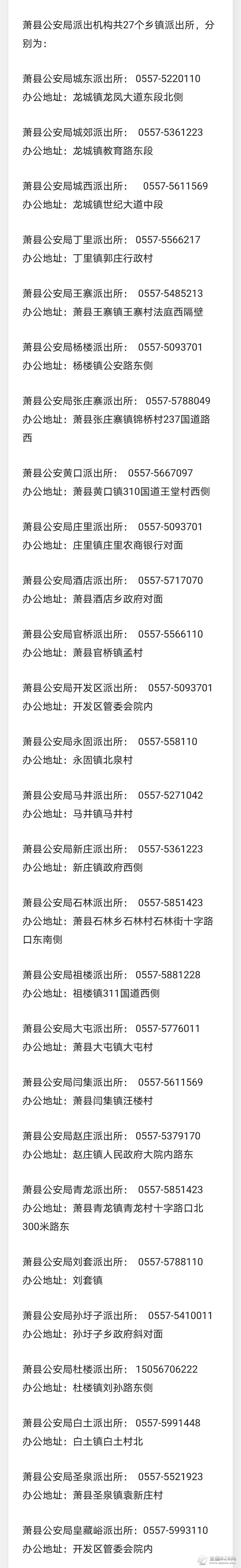 宿州市萧县27个乡镇派出所联系电话及办公地址大全:派出所工作时间除户籍窗口依照工作日时间值班,其余岗位为24小时值班,群众有困难可及时拨打派出所电话求助。