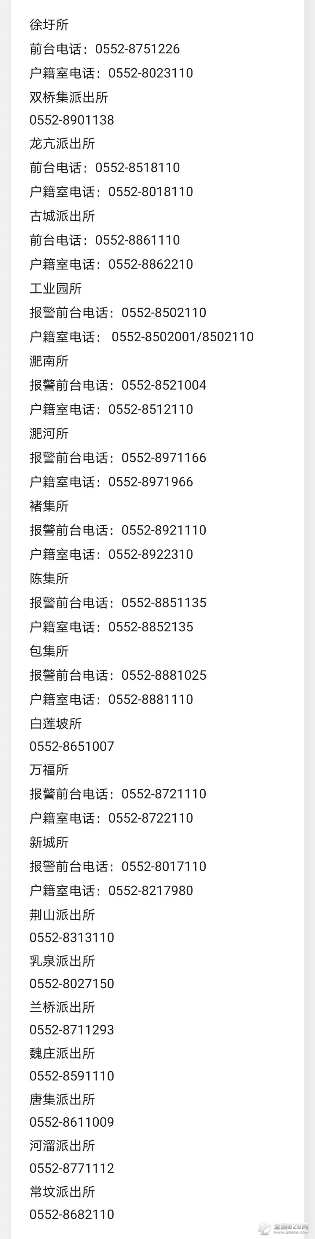 提示:怀远县辖区派出所前台值班电话号码大全表信息来源于怀远县政府网站公开之内容,整理转载此文是出于传递更多便民服务信息之目的。若有来源标注错误或者其它差错或侵犯了您的合法权益,请与本网站联系,我们将及时更正、删除,谢谢。