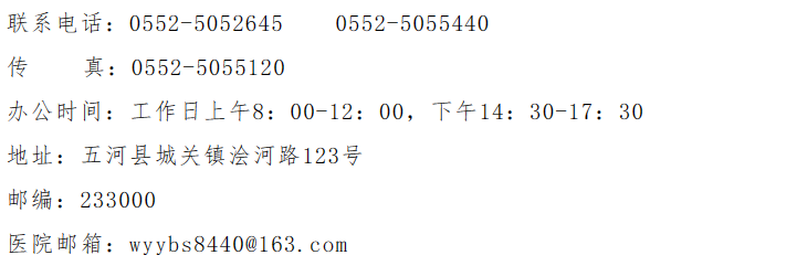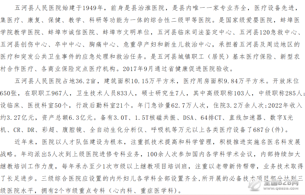 提示:五河县人民医院简介及医院联系电话号码信息来源于五河县政府网站公开之内容,整理转载此文是出于传递更多便民服务信息之目的。若有来源标注错误或者其它差错或侵犯了您的合法权益,请与本网站联系,我们将及时更正、删除,谢谢。