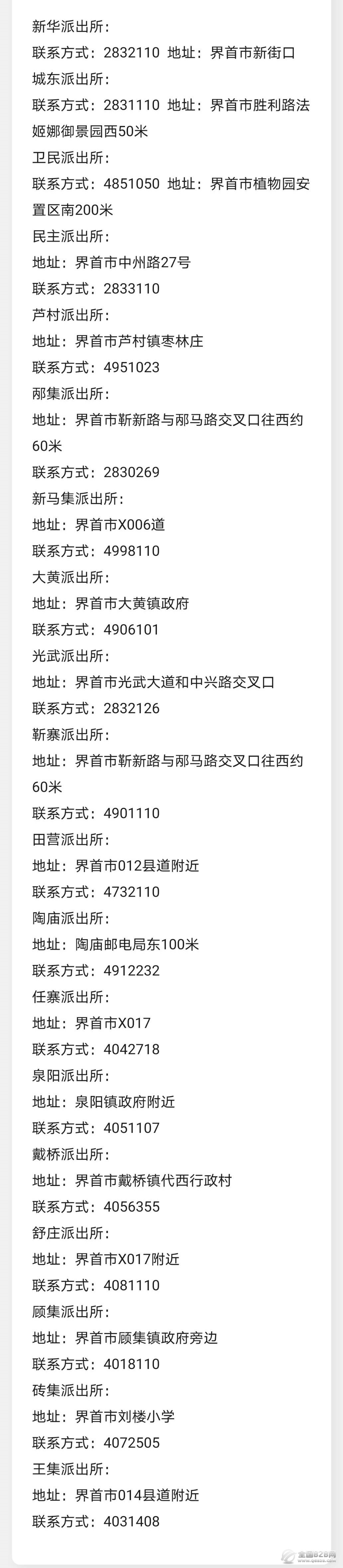 便民信息:安徽界首市辖区派出所联系方式及办公地址一览表。