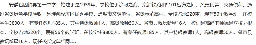 提示:安徽省固镇县第一中学简介和联系电话号码信息来源于固镇县政府网站公开之内容,整理转载此文是出于传递更多便民服务信息之目的。若有来源标注错误或者其它差错或侵犯了您的合法权益,请与本网站联系,我们将及时更正、删除,谢谢。