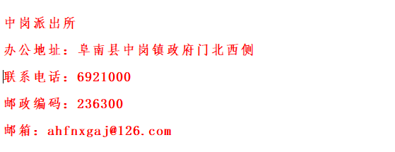 阜南县中岗镇派出所联系电话和邮箱信息公开: