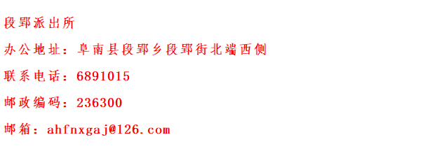提示:安徽阜南县段郢派出所联系电话号码信息来源于阜南县政府网站公开之内容,整理转载此文是出于传递更多便民服务信息之目的。若有来源标注错误或者其它差错或侵犯了您的合法权益,请与本网站联系,我们将及时更正、删除,谢谢。