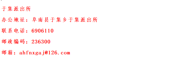 便民信息:阜南县于集派出所联系邮箱和联系电话。