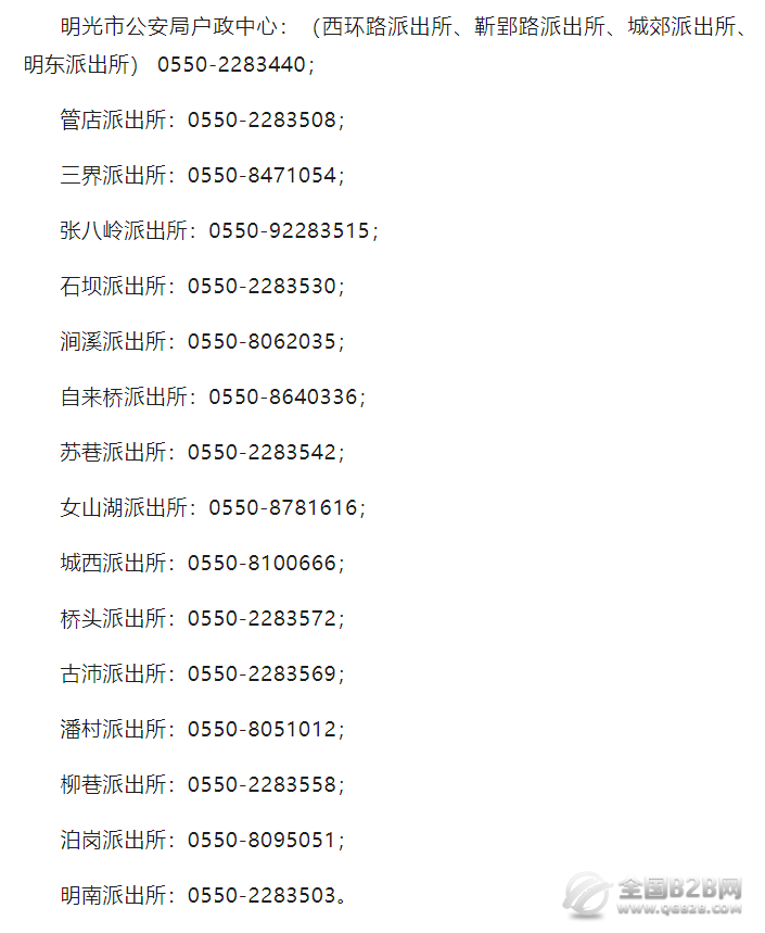 明光市辖区派出所户籍咨询服务电话号码大全: