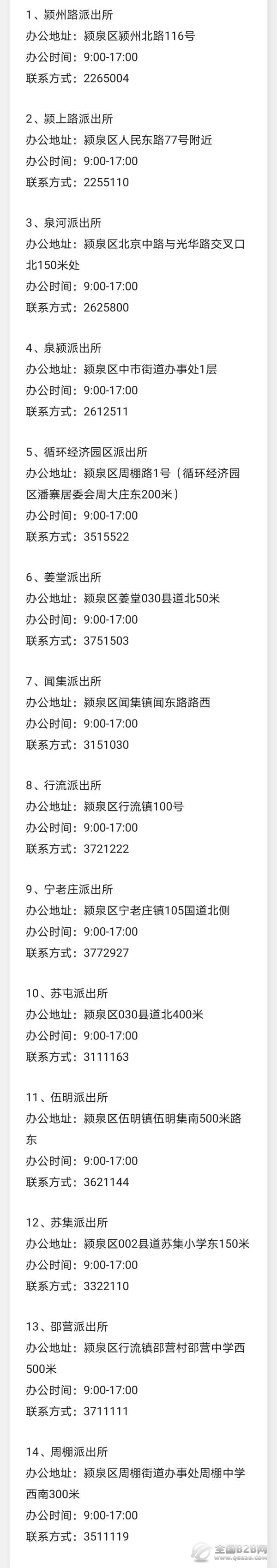 阜阳市颖泉区各派出所联系方式(单位电话和办公地址)信息大全表: