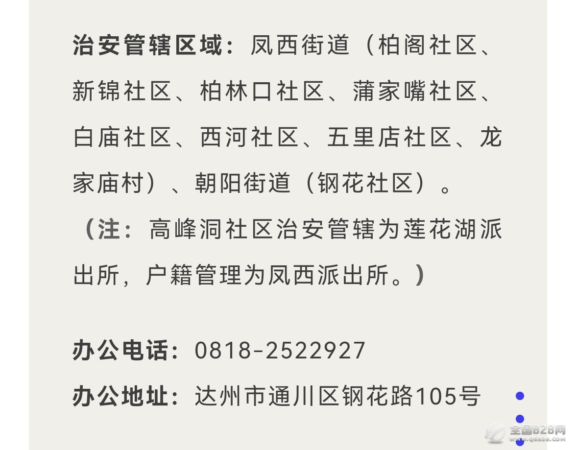 达州市通川区凤西派出所管辖区域和办公联系电话号码: