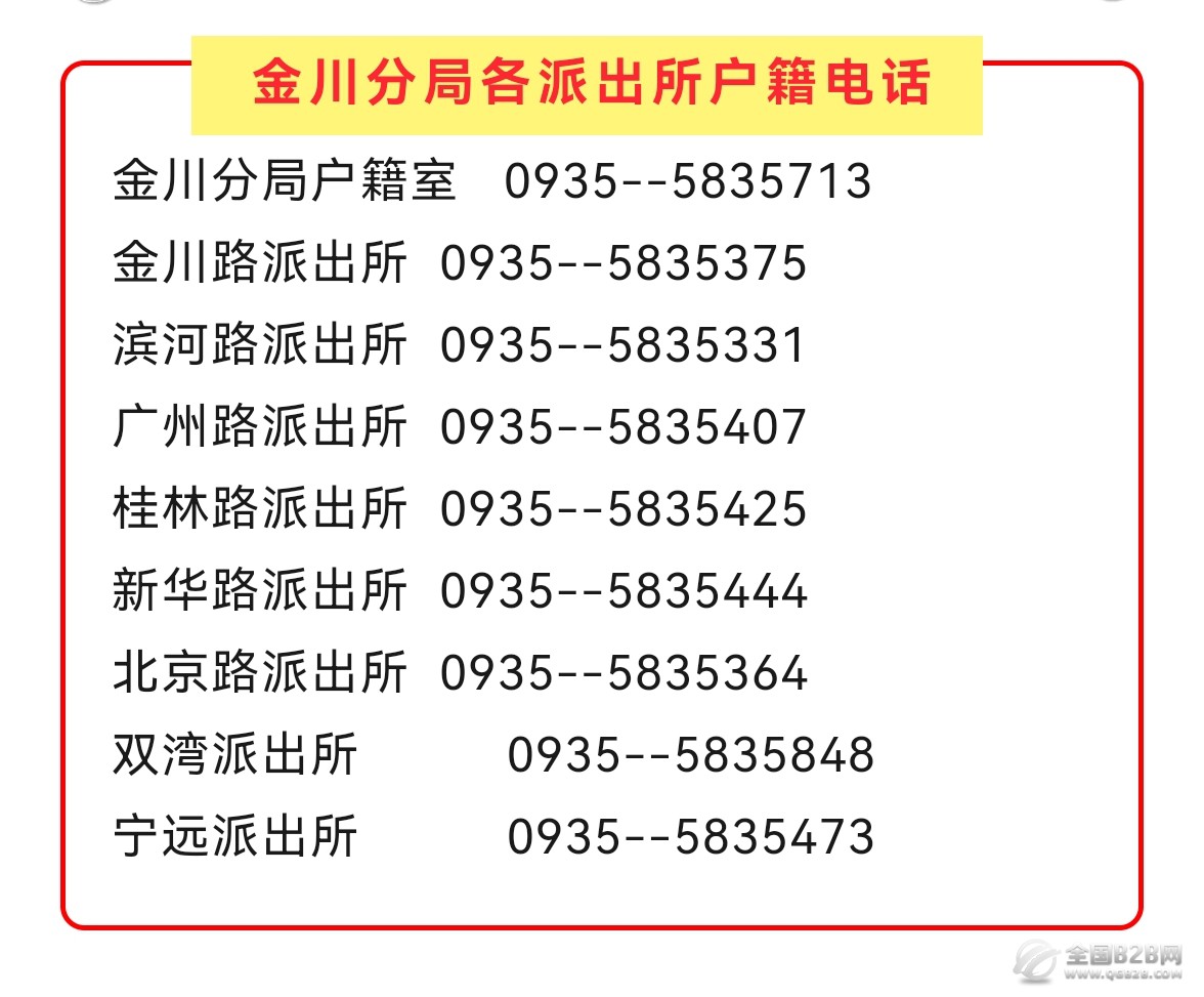 便民信息:金昌市金川区各派出所户籍咨询电话号码大全。为了更好的服务经济发展和人民生活,进一步转变作风,提高履职水平,提升人民群众满意度,现将金昌市金川区各派出所户籍咨询电话号码整理并公开如下: