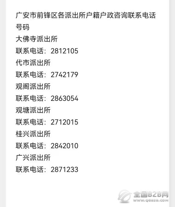 广安市前锋区各派出所户籍户政咨询电话号码大全: